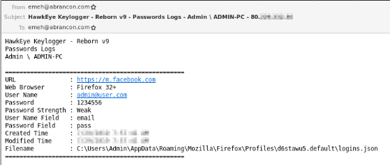 This is also heavily obfuscated, this time with SmartAssembly, and so much so that no decompilers are able to successfully process it. Using dynamic analysis, however, it is possible to see that the hawkeye application extracts two Nirsoft utilities (WebBrowser PassView and Mail PassView) from the PE resource section and injects them into vbc.exe. This extracts saved credentials from browsers and email clients and saves them to temporary files on disk. The malware then queries the machine’s IP address using bot.whatismyipaddress.com, before returning any obtained credentials, the machine’s IP address, hostname and currently logged in user via email: