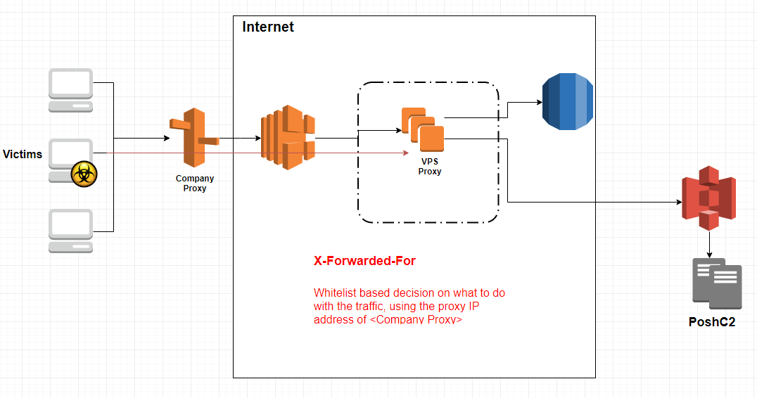 Generally, the following infrastructure is set up to support a PoshC2 instance. This includes a number of redirectors or Internet Proxies that forward C2 communications back to the PoshC2 instance, limiting exposure of the C2 servers and allowing a flexible approach to building many redirectors to combat take-downs or blocked URL’s.