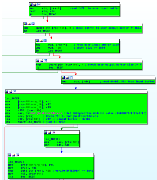 The vulnerable function fetches a pointer from the IOCTL’s input buffer and checks if it is greater or equal to nt!MmHighestUserAddress (0x00007ffffffeffff in x64). If that’s true, then the function will proceed by dereferencing that pointer and evaluating the first byte located at that memory address.