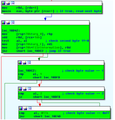 Here we notice further byte value checks, and specifically the second byte of the buffer referenced by RCX should be 0xFF in order to access the final part of our analysis.