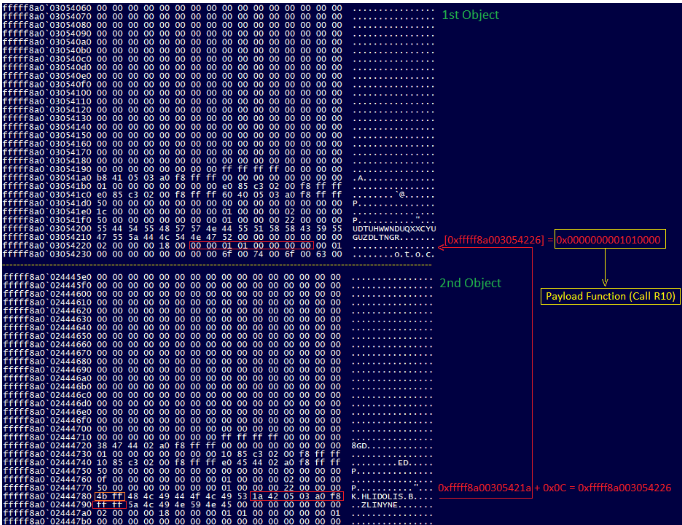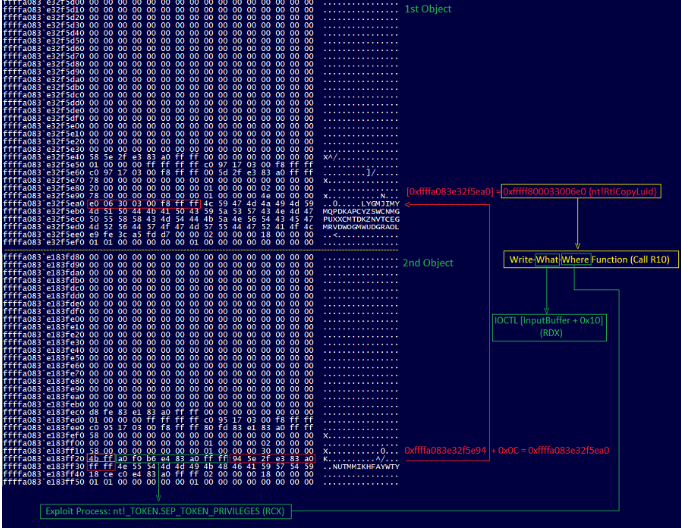 The image above shows how the two objects are ‘interconnected’ in order to complete our “write-what-where” primitive to finalize the exploit.