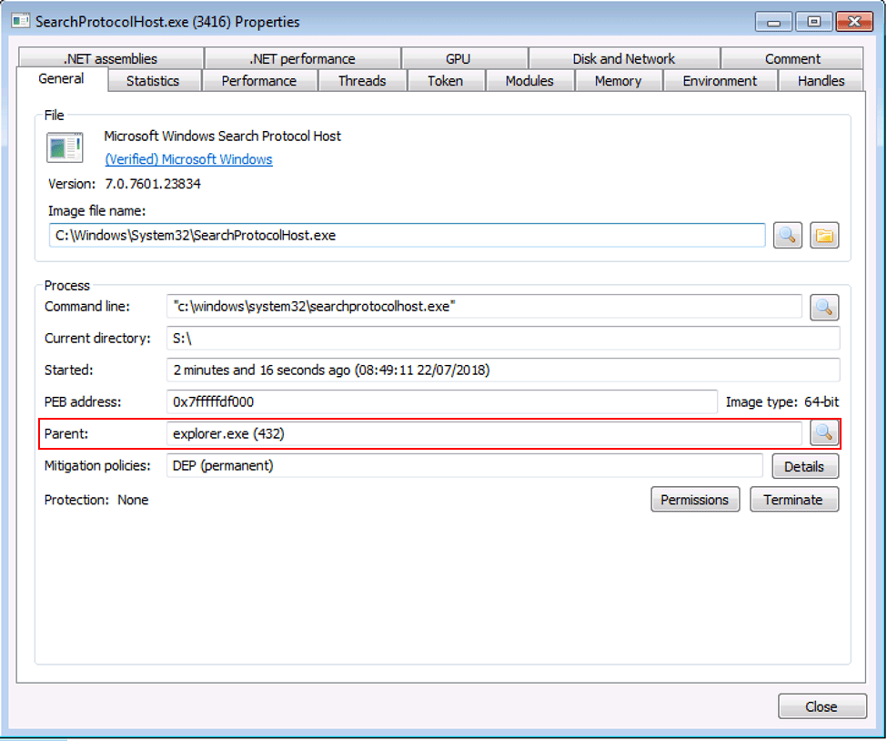 Here is an example of parent process spoofing in Windows 7. The following command was ran to migrate the process searchprotocolhost.exe and set the parentid of explorer (pid: 432). Note, this was all done using a standard user account.