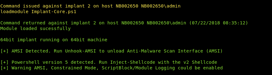 A new feature we’ve added is an Anti-Malware Scan Interface (AMSI) checker. We have baked this into the core-implant module. This does a quick process check using PowerShell and determines if the amsi.dll is loaded into the core implant. If this module is loaded, it will notify you through the C2Server response and provide a way of unhooking this DLL.