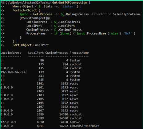 Get-NetTCPConnection | Where-Object { $_.State -eq 'Listen' } | ForEach-Object { $proc = Get-Process -Id $_.OwningProcess -ErrorAction SilentlyContinue [PSCustomObject]@{ LocalAddress = $_.LocalAddress LocalPort = $_.LocalPort OwningProcess = $_.OwningProcess ProcessName = if ($proc) { $proc.ProcessName } else { 'N/A' } } } | Sort-Object LocalPort |