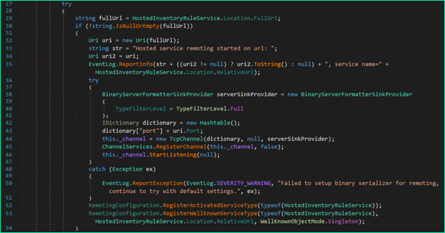 Further inspection of the decompiled code revealed that the application was using the BinaryServerFormatterSinkProvider with TypeFilterLevel set to Full — a configuration known to be unsafe because it enables full object deserialization without restriction. This insecure setup allows attackers to send crafted .NET objects to the server, which will be automatically deserialised and lead to arbitrary method execution. This vulnerability class was originally explored by James Forshaw in 2014 and further augmented in subsequent research highlighting how legacy .NET Remoting can be exploited for unauthenticated remote code execution.