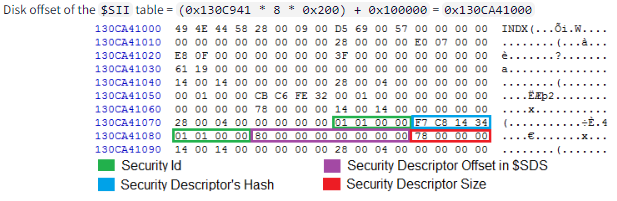 We can see the corresponding entry for this Security Id, which gives us the offset (0x80) of the Security Descriptor inside the $SDS stream. In this case it’s the second entry. Notice also that the hash of the Security Descriptor taken from the $SII entry matches the hash in the $SDS entry.