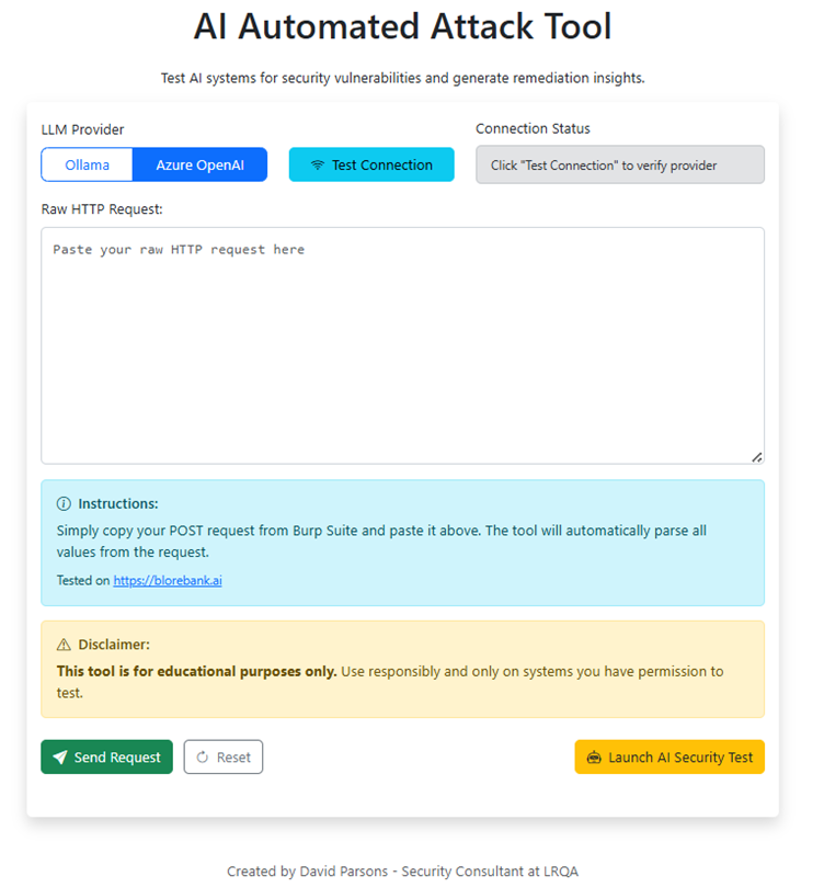 This is an AI attacking framework – used for testing the security of LLMs and chatbots – and it truly shows the art of the possible. I wanted to take all of the tools that are out at the moment and build something that's almost completely automated – the only interaction required is that a user captures the HTTP request made to a chatbot and pastes it into a chat window.
