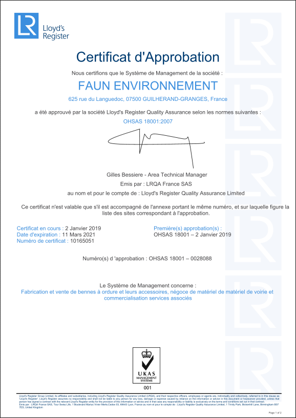 Après l’obtention récente de sa certification ISO 14001, FAUN Environnement a renouvelé sa certification OHSAS 18001, qui valide son système de management de la santé et de la sécurité au travail, autrement dit de prévention de risques professionnels.