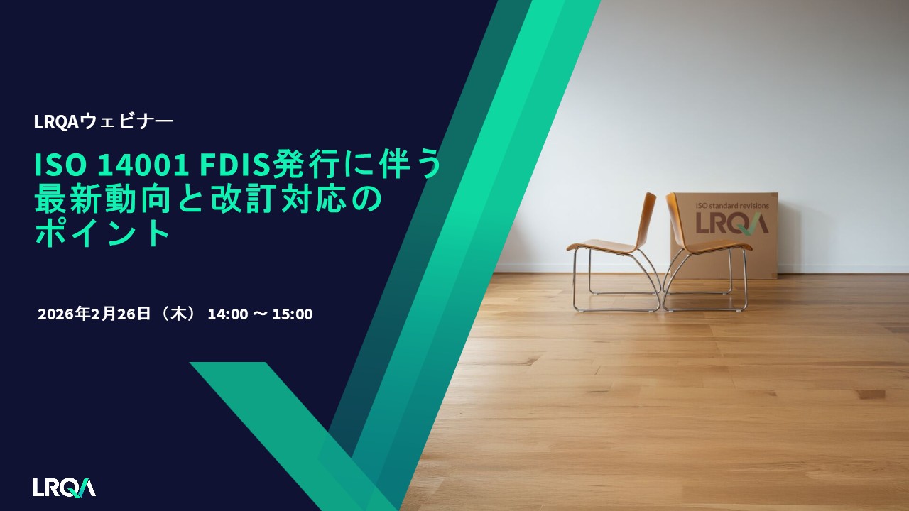 この度、LRQAはISO 14001(環境)のFDIS発行に伴い、改訂に関する最新情報をお届けするウェビナーを2月26日(木)開催いたします。改訂背景や主要な変更点、そして企業のマネジメントシステムに与える影響を、実務に役立つ視点でわかりやすく解説します。