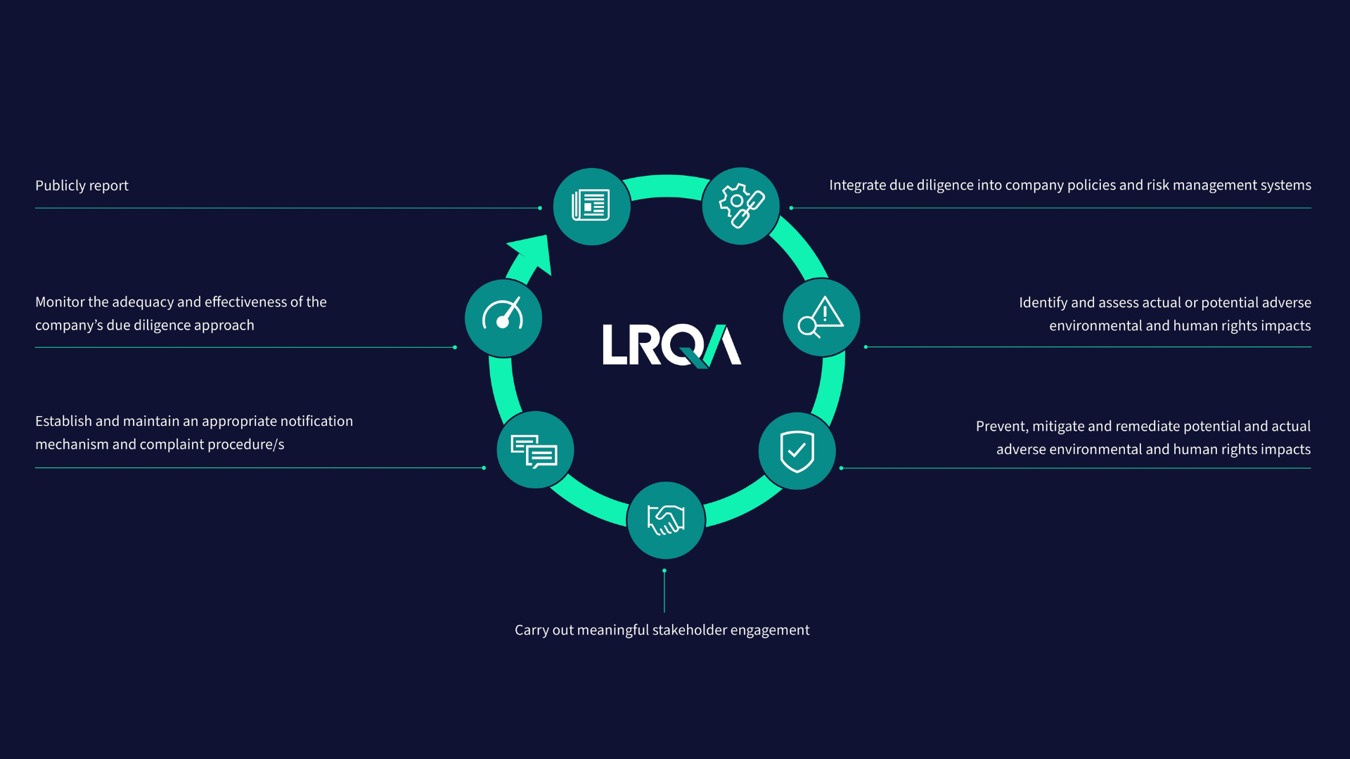 LRQAは、国際的な規制やベストプラクティスに準拠した効果的な人権と環境に関するデューデリジェンス(HREDD)の実施を支援する幅広いサービスを提供しています。LRQAは、HREDDサイクルのあらゆる段階において、構造化された包括的なアプローチで組織をサポートする最適な立場にあります。そのサービスには、以下のものが含まれます。
