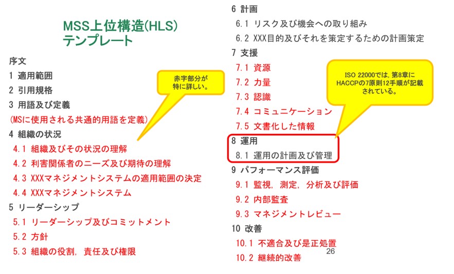 ISOにはマネジメントシステムに関する多くの規格があります。そこで2012年に、すべてのマネジメントシステム規格を共通の構造にするために、上位構造(HLS・ハイレベルストラクチャー)が共通テンプレートとして開発されました。ハイレベルストラクチャーは10章立てですので、もとは8章立てだったISO 9001ISO 22000も、今では10章立てになっています。