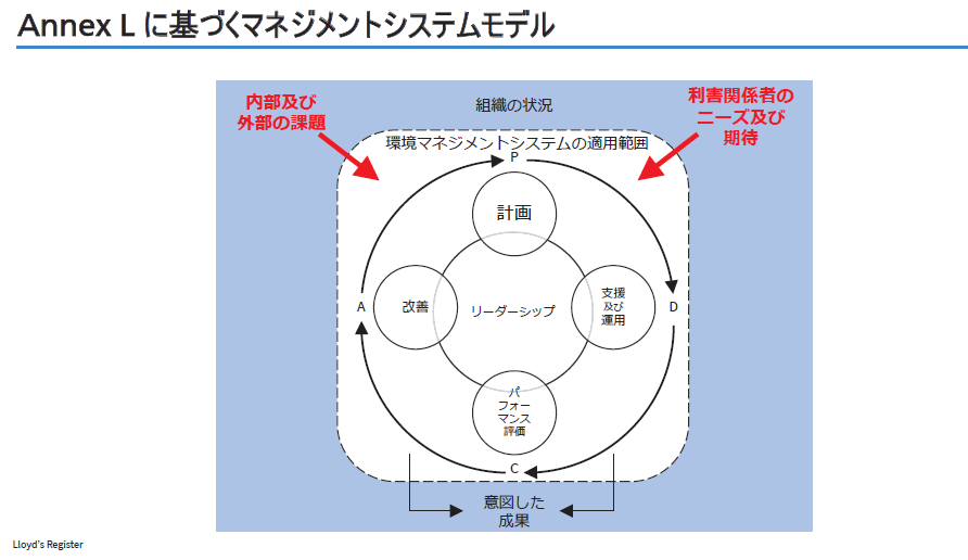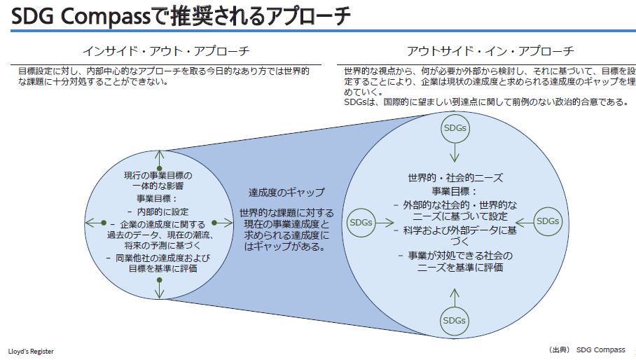 GRI(Global Reporting Initiative),国連グローバル・コンパクト(UNGC)、持続可能な開発のための世界経済人会議(WBCSD)が共同で作成したガイドライン『SDG Compass』では、SDGs達成のための目標設定を世界的・社会的なニーズから考える「アウトサイド・イン・アプローチ」を提唱しています。このアプローチも、ISOマネジメントシステムの共通構造「Annex L」が意図する、 “内部および外部の課題に応じて目標を設定し、利害関係者のニーズ及び期待に応えていく”PDCAサイクルと、共通するものでしょう。