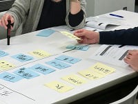 研修開始前、担当講師は研修開始時間の約30分前から準備に取り掛かります。研修で使用する備品や掲示物、グループワークで使用するポストイットや、それらを貼る用紙などの準備をします。