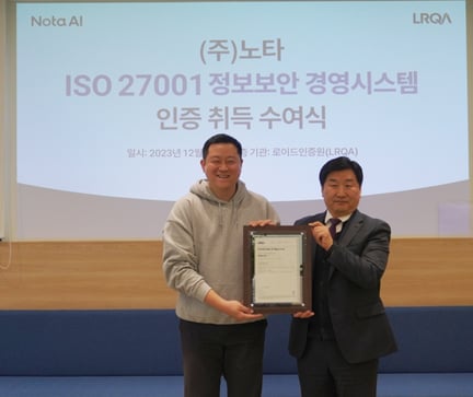 노타 AI - ISO 27001 인증수여식 2023년 12월 4일 월요일 2023년 12월 4일 노타 AI의 ISO 27001 (정보보안경영시스템) 인증 획득을 축하하는 인증 수여식이 노타 AI 에서 진행되었습니다. 더 읽어보기