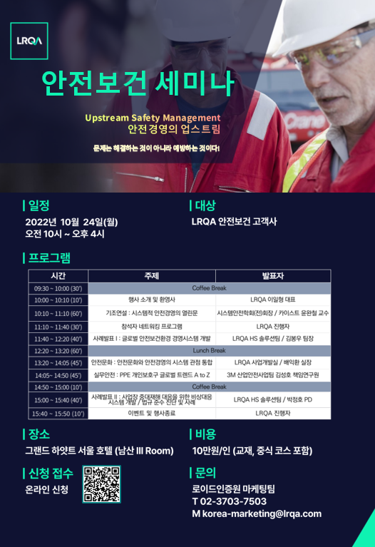 LRQA는 이번 ‘안전보건 세미나’를 통해 안전보건경영에 대한 업스트림 관리를 주제로, 글로벌 안전보건 트랜드를 살펴보고, 안전문화, 근본원인의 개선, 중처법 대응 법규 진단 사례 등을 이야기 나누고자 합니다.