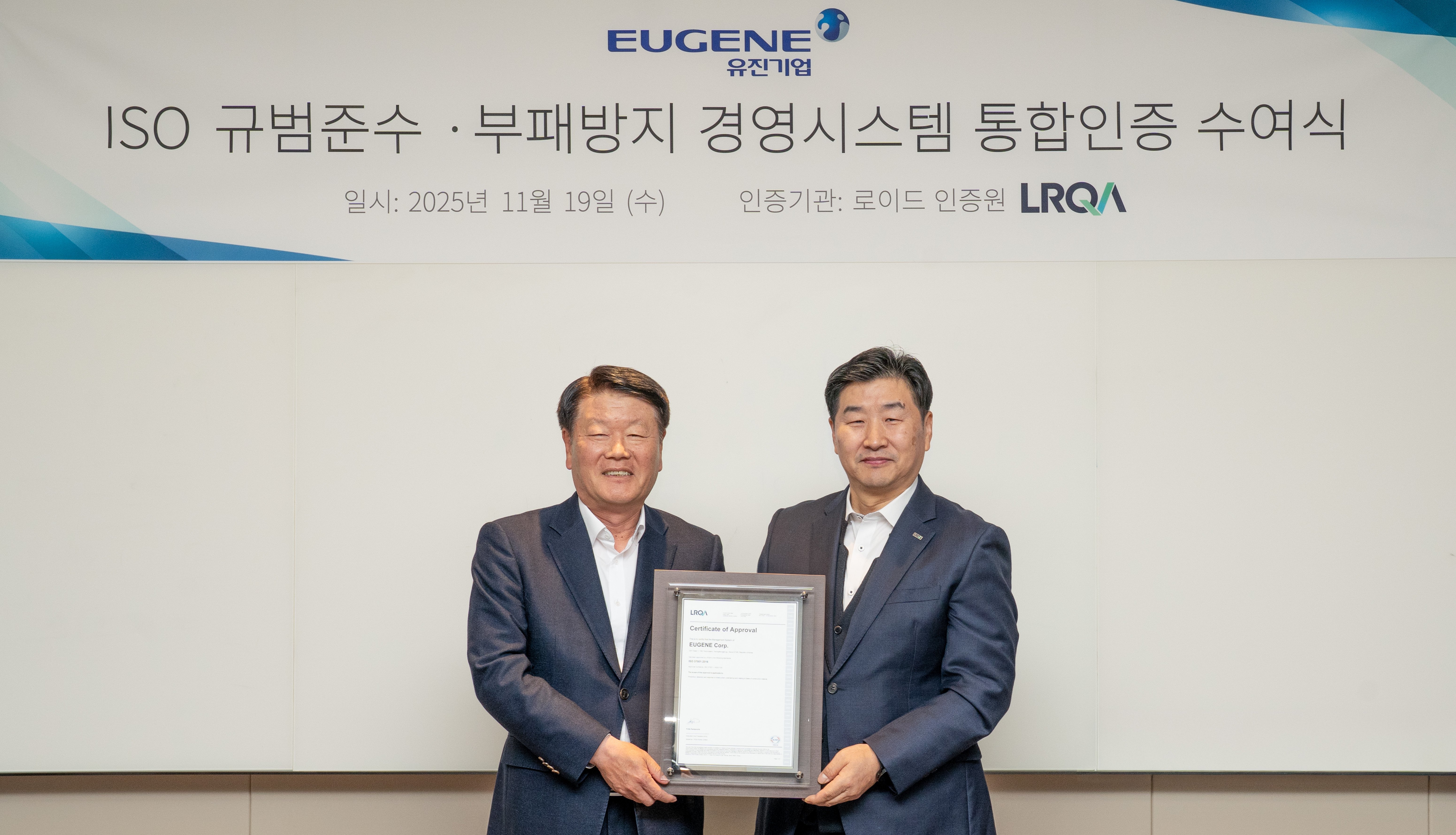 11월 19일 서울 유진빌딩에서 유진기업에 부패방지 경영시스템 (ISO 37001) 및 규범 준수 경영시스템(ISO 37301) 인증서를 전달했습니다.