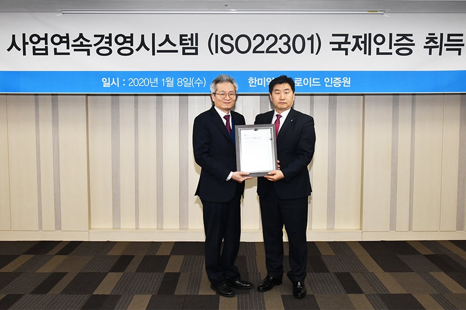 적극적인 연구개발을 바탕으로 글로벌 기업으로 거듭나고 있는 한미약품그룹이 국내 제약업체 최초로 ISO 22301 사업연속성경영시스템 인증을 받아, 이를 기념하기 위해 1월 8일 한미약품 서울 본사에서 인증수여식이 개최되었습니다.