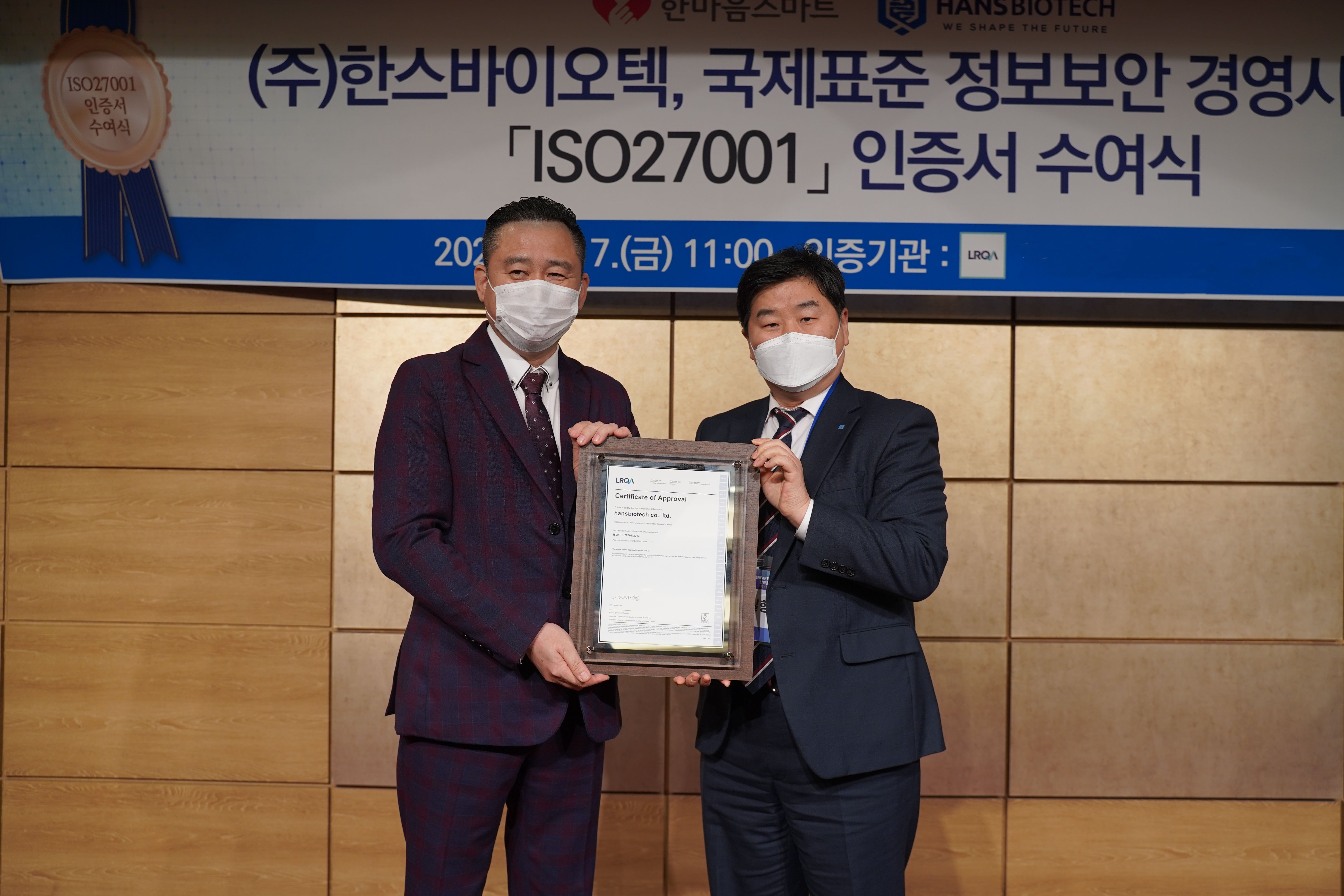 한스바이오텍이 정보보안 경영시스템 ISO 27001 을 로이드인증원 (LRQA) 으로부터 획득하였습니다.