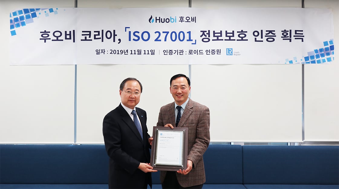 글로벌 디지털 자산거래소 후오비 코리아(Huobi Korea)가 로이드인증원으로부터 정보보안 경영시스템 ISO 27001 인증을 획득하여, 지난 11월 11일 후오비 코리아 본사에서 인증수여식이 개최되었습니다.