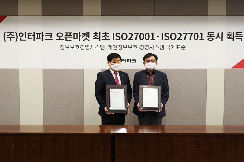 인터파크는 로이드인증원(LRQA)의 심사를 통해 지난 10월 6일 ISO 27001 인증을 취득하였고, 11월 21일에는 ISO 27701 인증까지 성공적으로 취득하였습니다. 이에 따라 인터파크는 국내 오픈마켓 가운데 최초로 한 해에 2개의 정보보안 국제 인증을 취득한 기업이 되어 더욱 의미있는 자리였습니다.