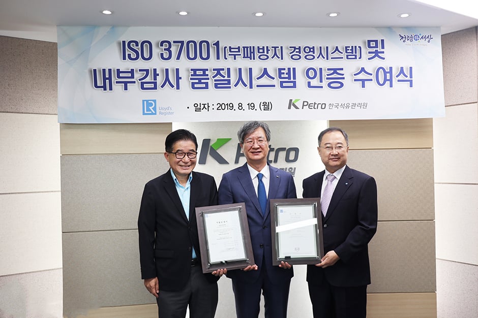 국내 석유 시장의 품질과 안전을 책임지는 공공기관인 한국석유관리원이 LRQA로부터 ISO 37001(부패방지경영시스템) 인증과 위험관리 및 내부감사 품질 제도의 적합성 증서를 받았습니다.
