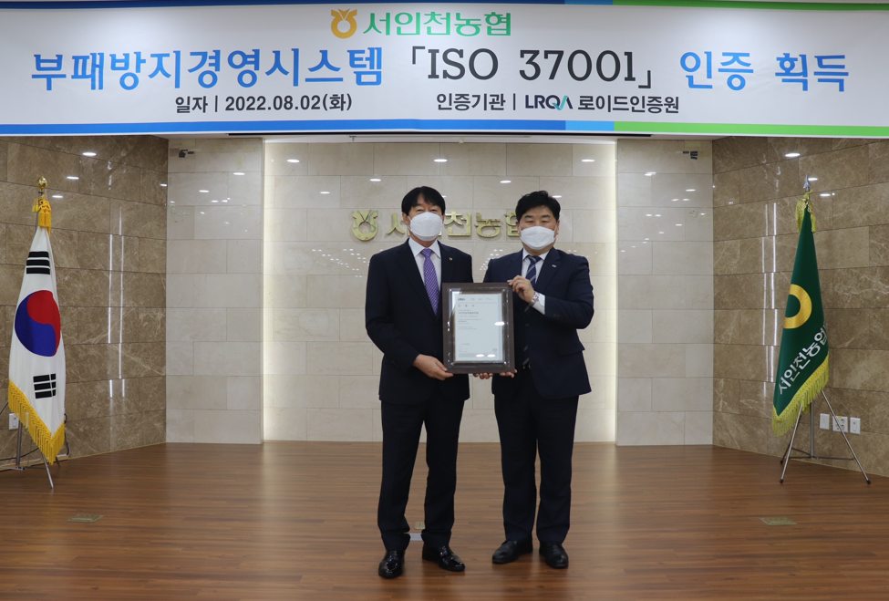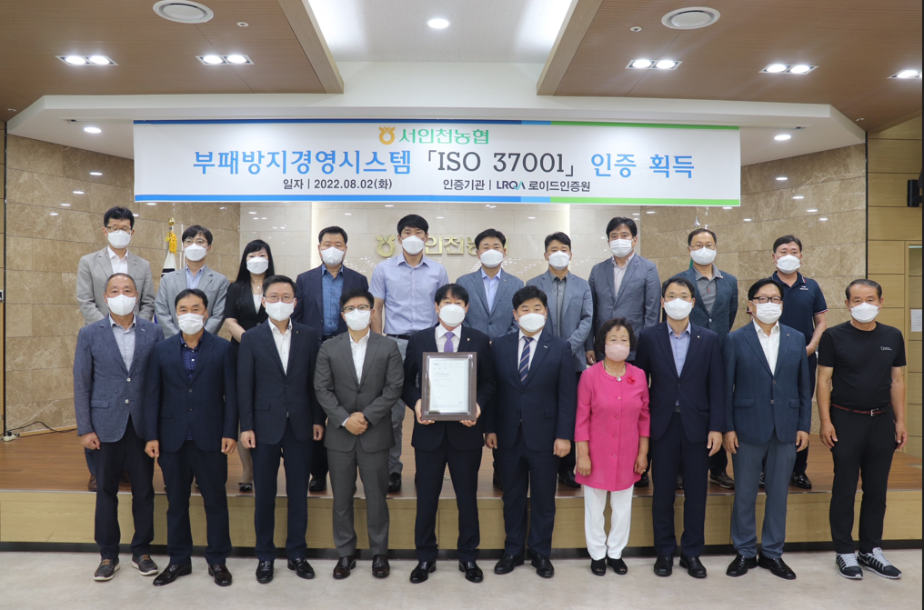 어제 8월 2일 , 서인천농협에서 이일형 LRQA 대표이사, 인천농협지역본부 이강영 본부장 및 관계자들과 함께 부패방지 경영시스템 ISO 37001 인증서 획득을 축하하는 인증수여식을 진행하였습니다.