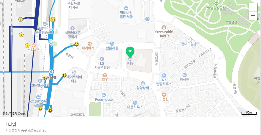 - 변경(서울역 부근): 04637 서울시 중구 소월로 2길 30, T타워 2층