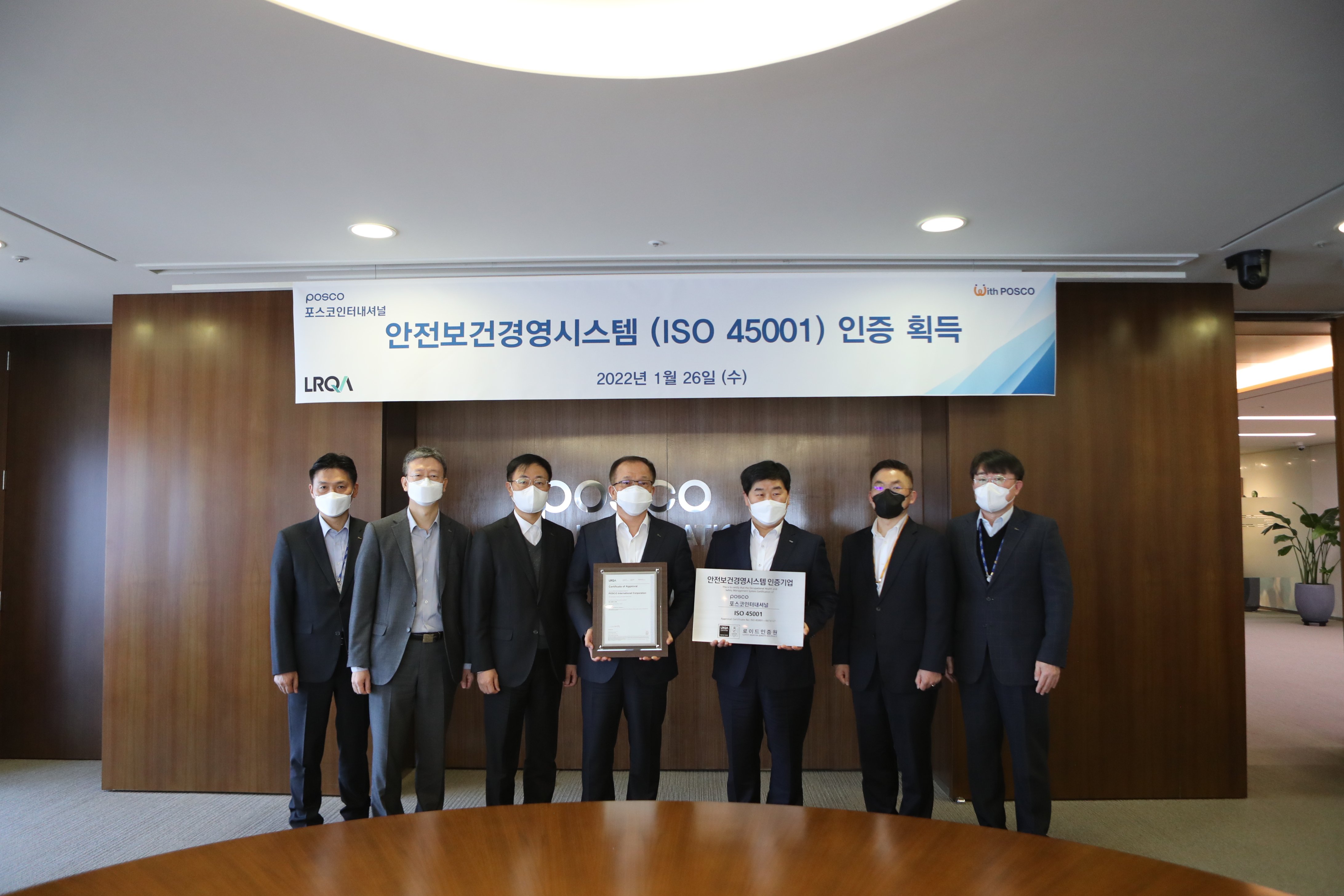 어제 1월 26일 포스코타워-송도 본사에서 안전보건경영시스템 ISO 45001 인증을 획득한 포스코인터내셔널에 대한 인증 수여식이 진행되었습니다.