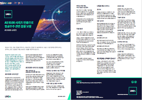 AS 9100 시리즈는 글로벌 항공우주산업에서 통용되는 유일한 품질 관리 시스템(QMS) 입니다. AS9100 시리즈의 특장점에 대해서 브로셔를 다운로드하여 확인해보세요!