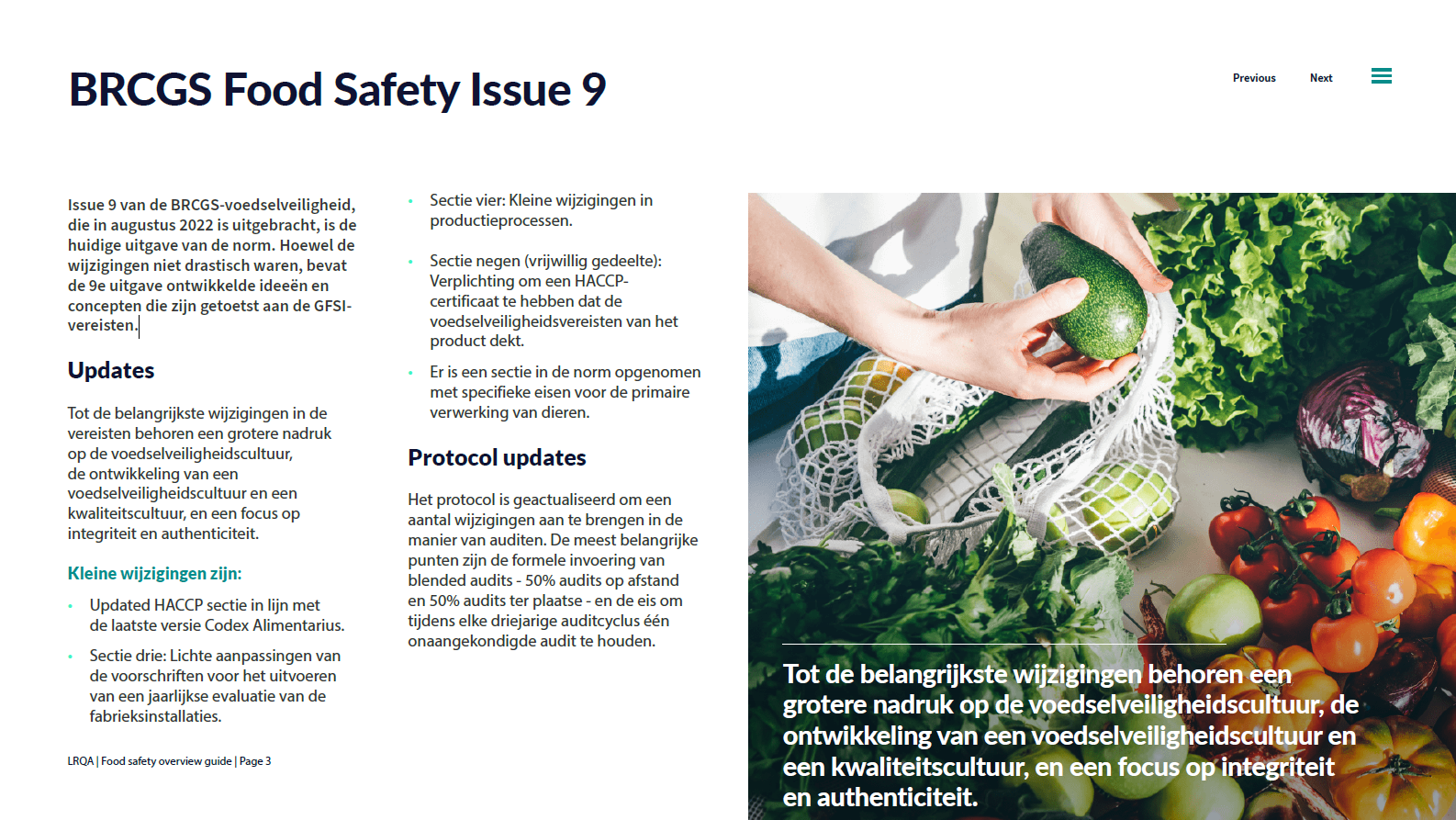 Issue 9 van de BRCGS-voedselveiligheidsnorm, die in augustus 2022 is uitgebracht, is de huidige uitgave van de norm. Hoewel de wijzigingen niet drastisch waren, bevat de 9e uitgave ontwikkelde ideeën en concepten die zijn getoetst aan de GFSI-vereisten. Download de gids voor een handig overzicht van alle wijzigingen.
