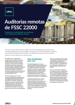 Ao ter a opção de realizar sua auditoria FSSC 22000 remotamente, você reduz o risco de qualquer dano à reputação que possa ser causado pela expiração da certificação e continua a fornecer aos seus clientes a garantia do fornecedor e a confiança em sua organização.